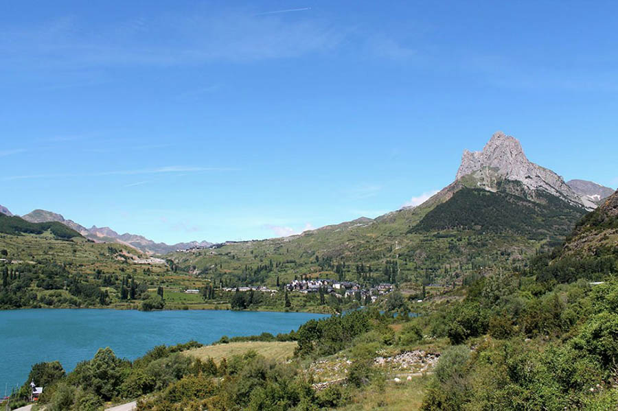 En Aragón podrás encontrar varios pueblos con paisajes tan bonitos como este. El Valle de Tena con el pantano de Lanuza de fondo.