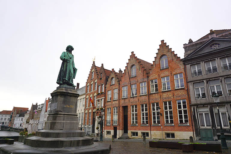 La plaza Jan Van Eyck estádedicada al famoso pintor flamenco (que tenía su taller aquí) con una estatua en el centro de la plaza. Es una de las mejores zonas de Brujas para pasear tranquilo y disfrutar de sus canales.