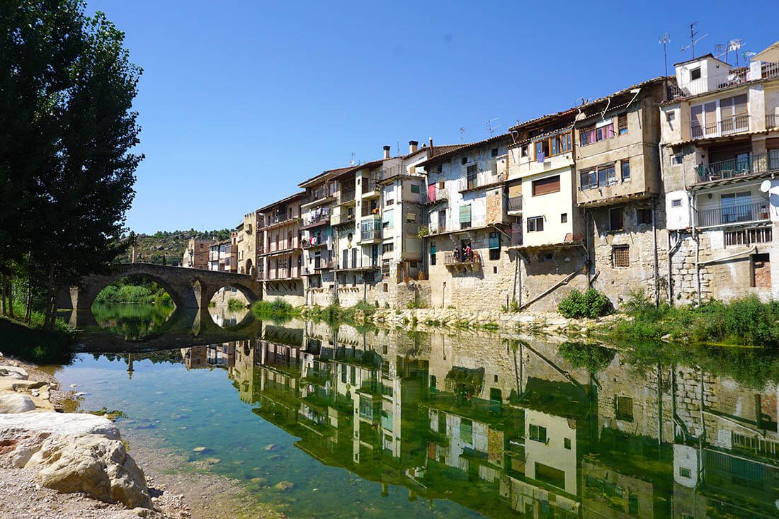 Una de las imágenes más bonitas y famosas de Valderrobres es la de su puente de piedra medieval del siglo XIV. Este puente separa el pueblo en dos y aquí se encuentran las casas colgantes sobre el río Matarraña.